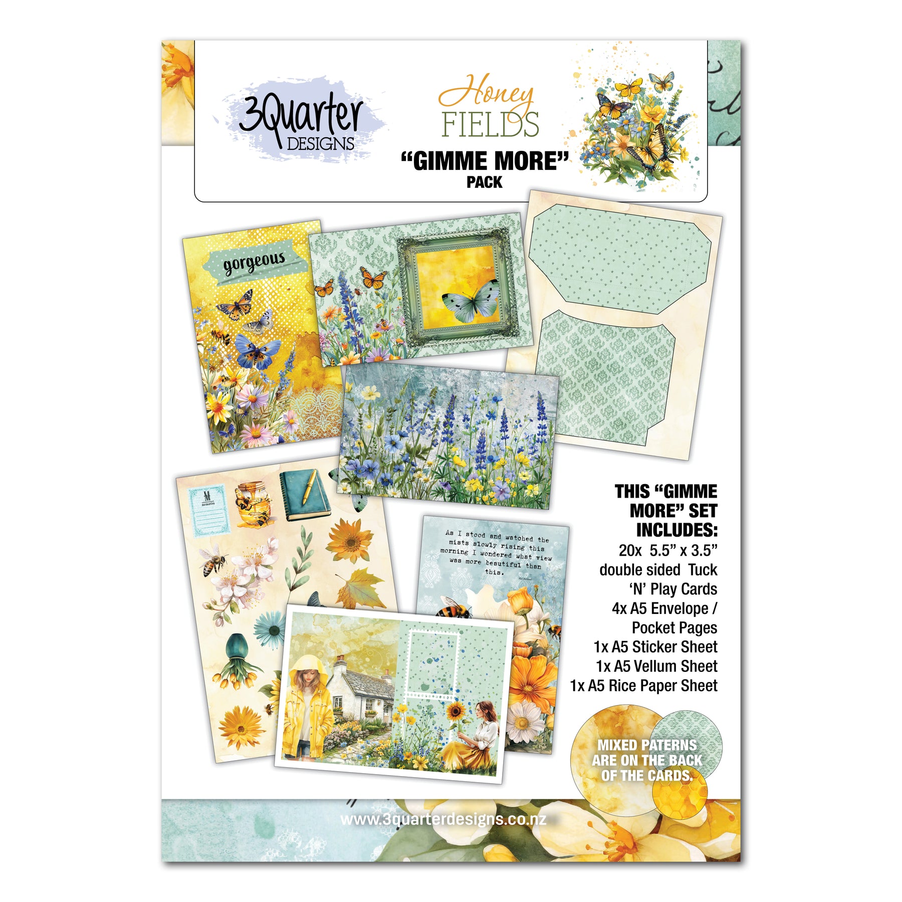 These packs feature 20 cards like the large tuck n plays (10 portrait and 10 landscape) plus now the pack features 4 envelope/pockets, 1 sheet of stickers, 1 sheet of vellum and 1 sheet of rice paper! This pack really has it all!