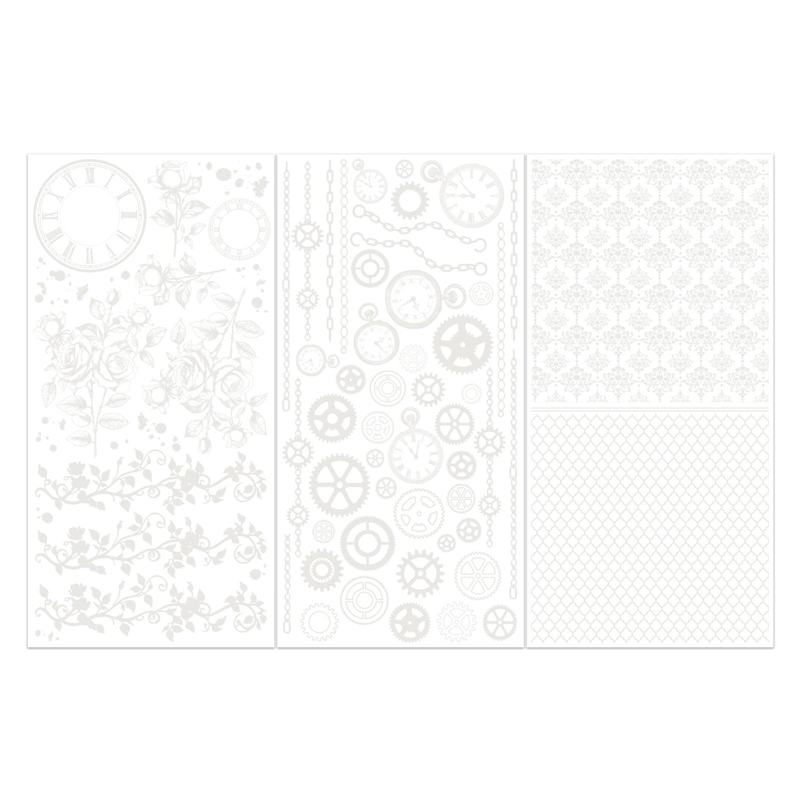 Discover the magic of mixed media with the new Irresistible Rub-on Transfers from 49 and Market. These innovative white rub-on transfers feature new technology that creates a no-halo background, eliminating the ghostly effect often seen on dark papers. This unique feature also allows you to add ink directly over the transfers to resist the design, opening up a world of creative possibilities. The Irresistable Times set from Joanne Bain includes vines, cogs (gears), and various textures. These rub-ons are typically used in scrapbooking, card making, and other paper crafts to add intricate details and a vintage or steampunk aesthetic.